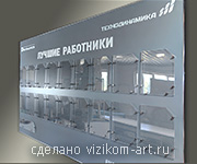 Оформление содержит накладные логотипы компании, слоган и стекла на дистанционных держателях для фото 18-ти лучших сотрудников. Поскольку макет стенда был разработан непосредственно заказчиком, специалисты Визиком-Арт выполнили технологическую доработку и усиление крепления профиля, исключающее деформацию конструкции размером 2.6×1.5м.