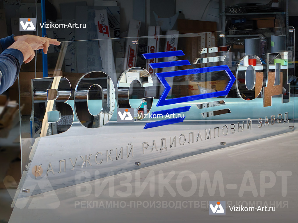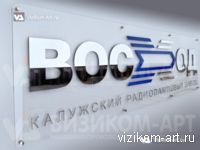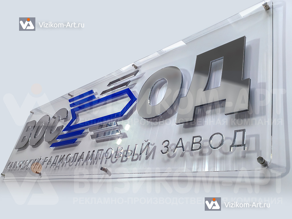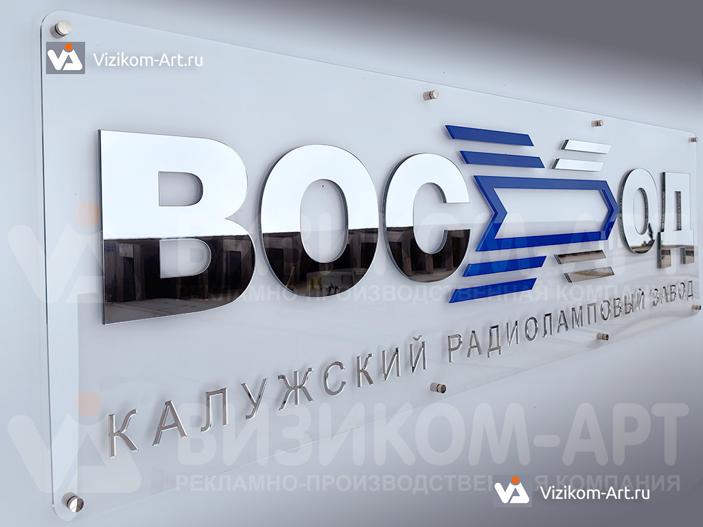 Оригинальная вывеска на акриловом стекле изготовлена для предриятия «Восход» - Калужский радиоламповый завод (г.Калуга). Накладные элементы логотипа предприятия из цветного и зеркального акрила закреплены на прозрачной основе, которая крепится к стене на 8-ми хромированных дистанционных держателях. Ширина вывески 2м. Предназначена для размещения в офисе компании, но используемая технология изготовления позволяет разместить вывеску и на фасаде здания. Зеркальные элементы хорошо отражают свет, а прозрачный фон органично сочетается с любой фактурой поверхности стены, от которой вывеска отстоит на 1.5см.