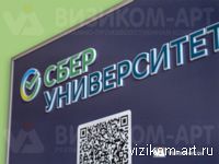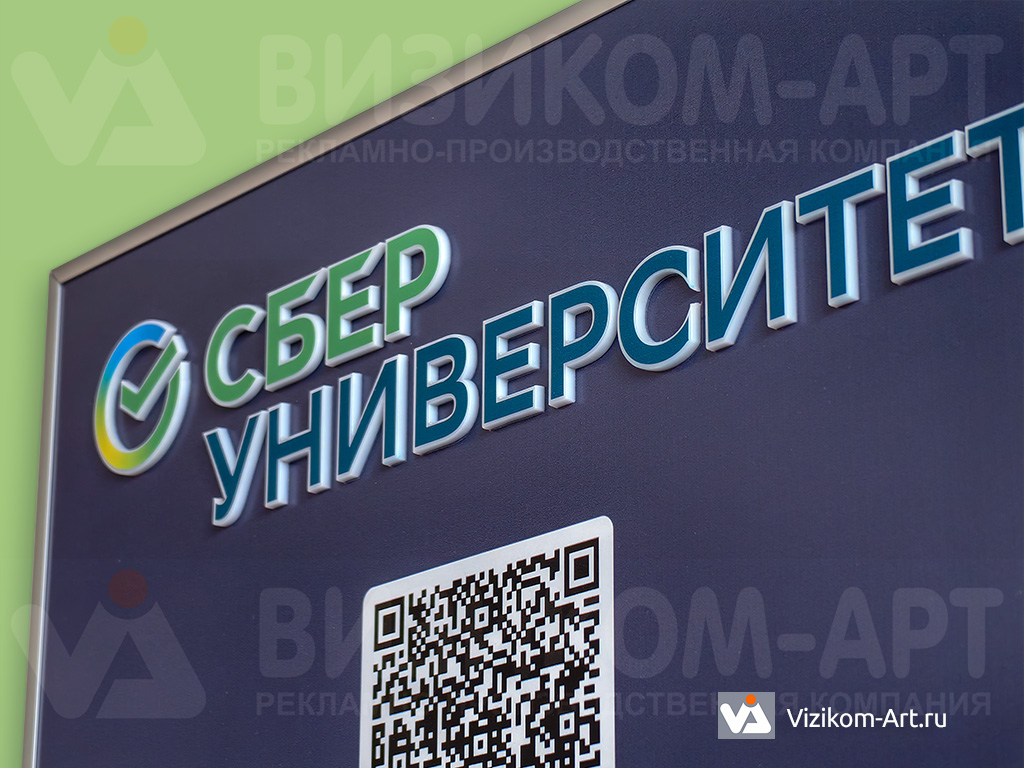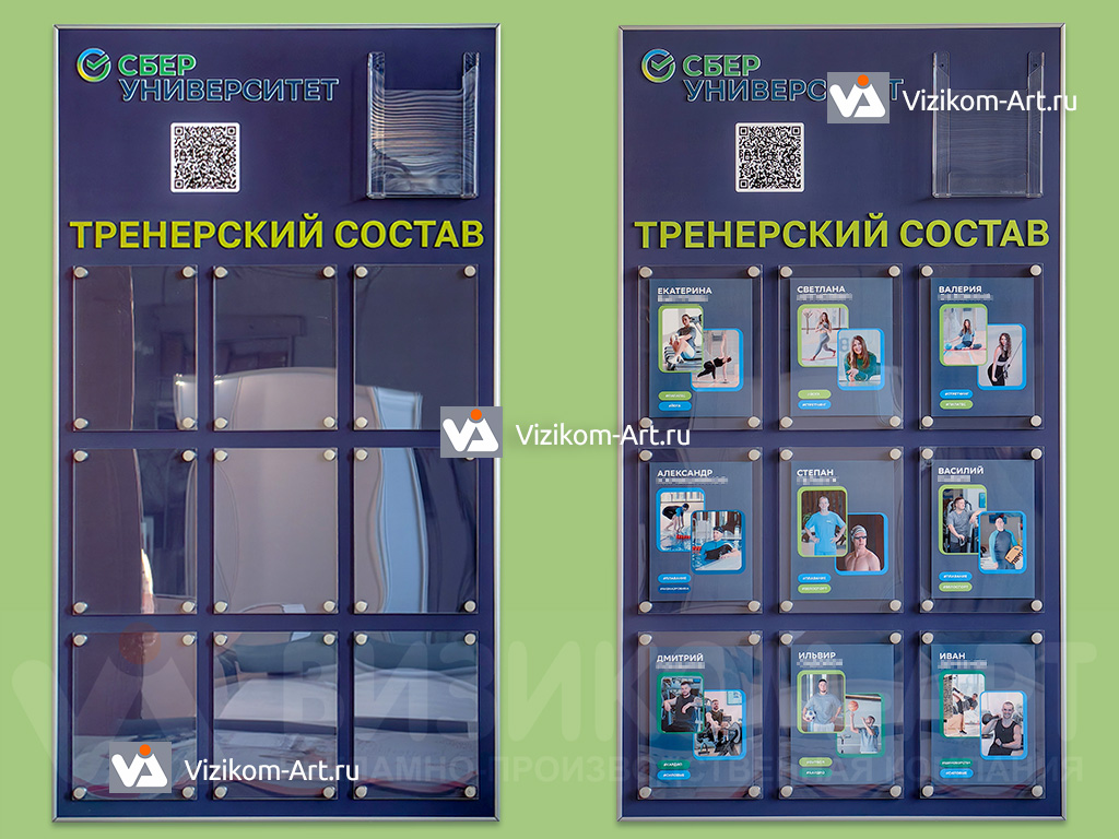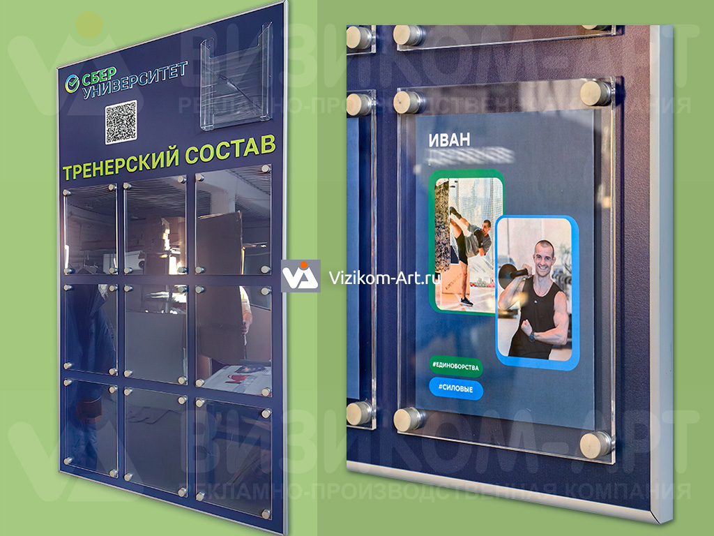 Информационный стенд изготовлен для кампуса СберУниверситета (корпоративного университета Сбербанка). На стенде размещаются фото тренеров спортивного центра с указанием специализаций (плавание, велоспорт, единоборства и др.) и буклеты с информацией. QR-код в верхней части стенда позволяет быстро перейти на страницу с подробным перечнем направлений работы и тренировок для каждого тренера. Стенд оформлен в корпоративном стиле. Название и логотип образовательного учреждения изготовлены в виде накладных элементов из акрилового стекла с использованием полиграфии высокого разрешения.